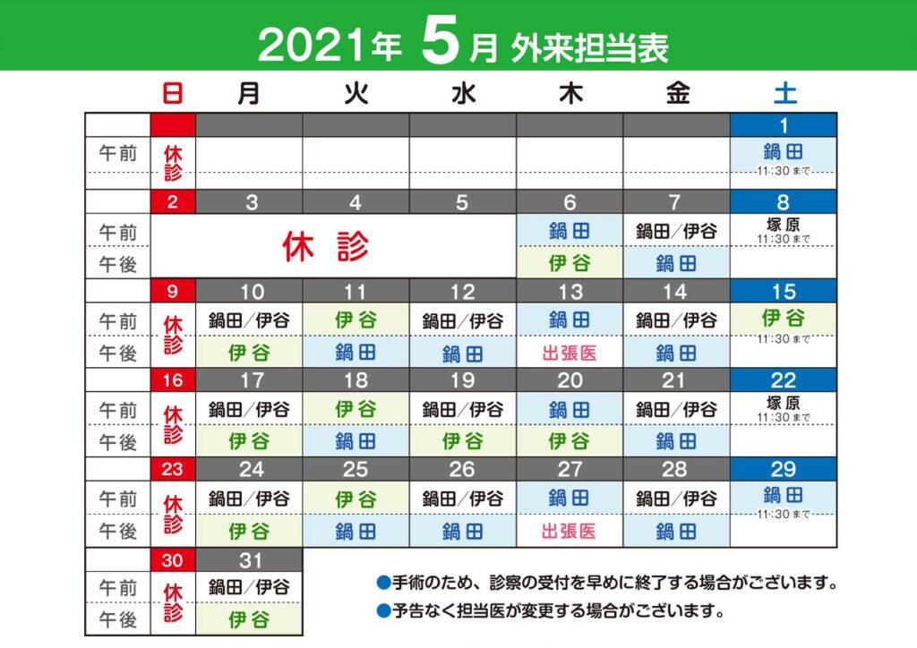 5月の診療日、休診日のお知らせになります。下記の表からご確認ください。