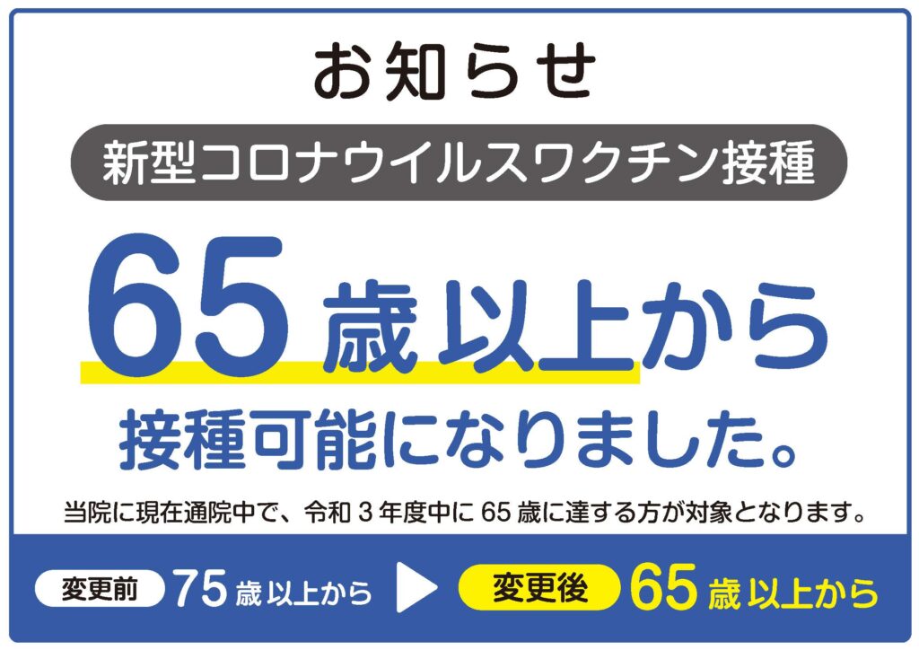 新型コロナウイルスワクチン接種が65歳以上から可能になりました。