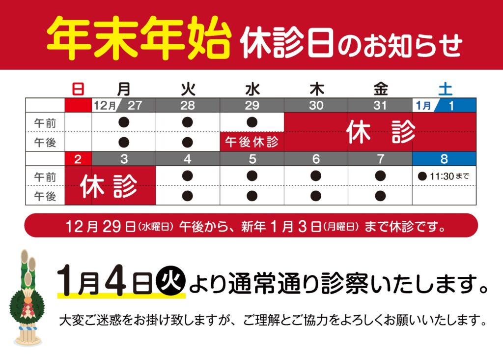 年末年始の休診日に関するお知らせになります。年内診察は12/29(水)の午前中までの診察となり、新年1/3(月)まで休診となります。1/4(火)からは通常通りの診察となります。詳しくは下記の表からご確認ください。