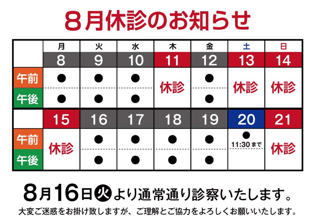 8月の休診日に関するお知らせになります。