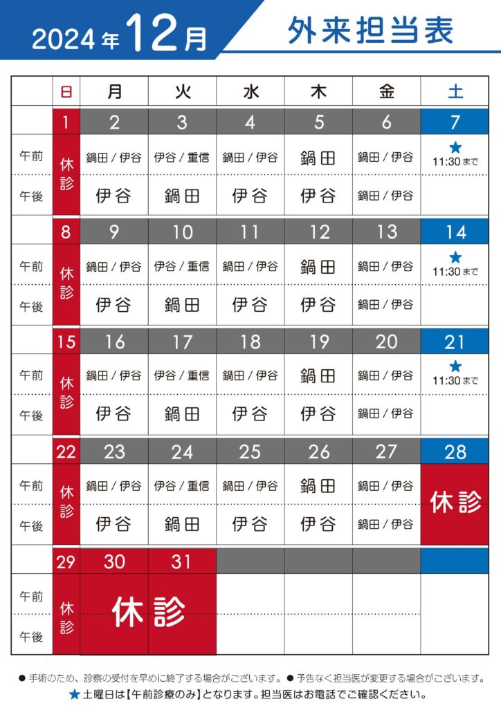 12月の休診日に関するお知らせになります。下記の表からご確認ください。