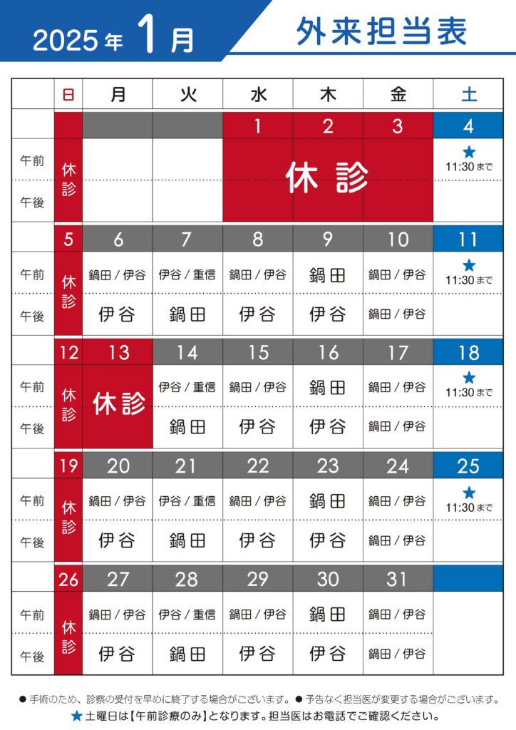 2025年1月の休診日に関するお知らせになります。下記の表からご確認ください。