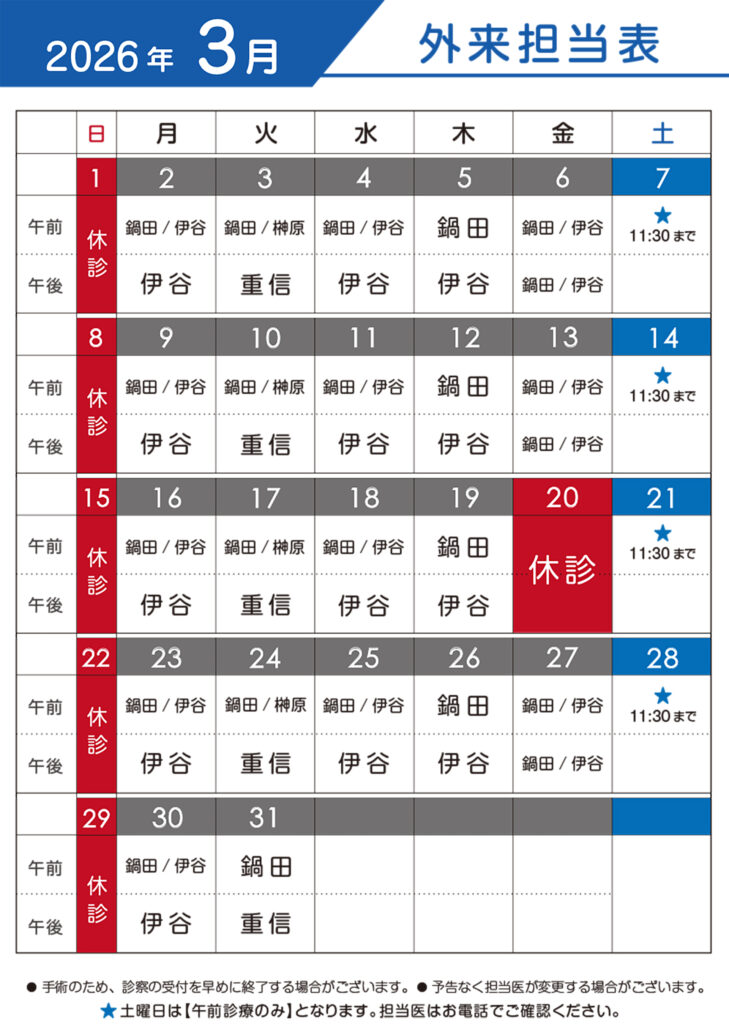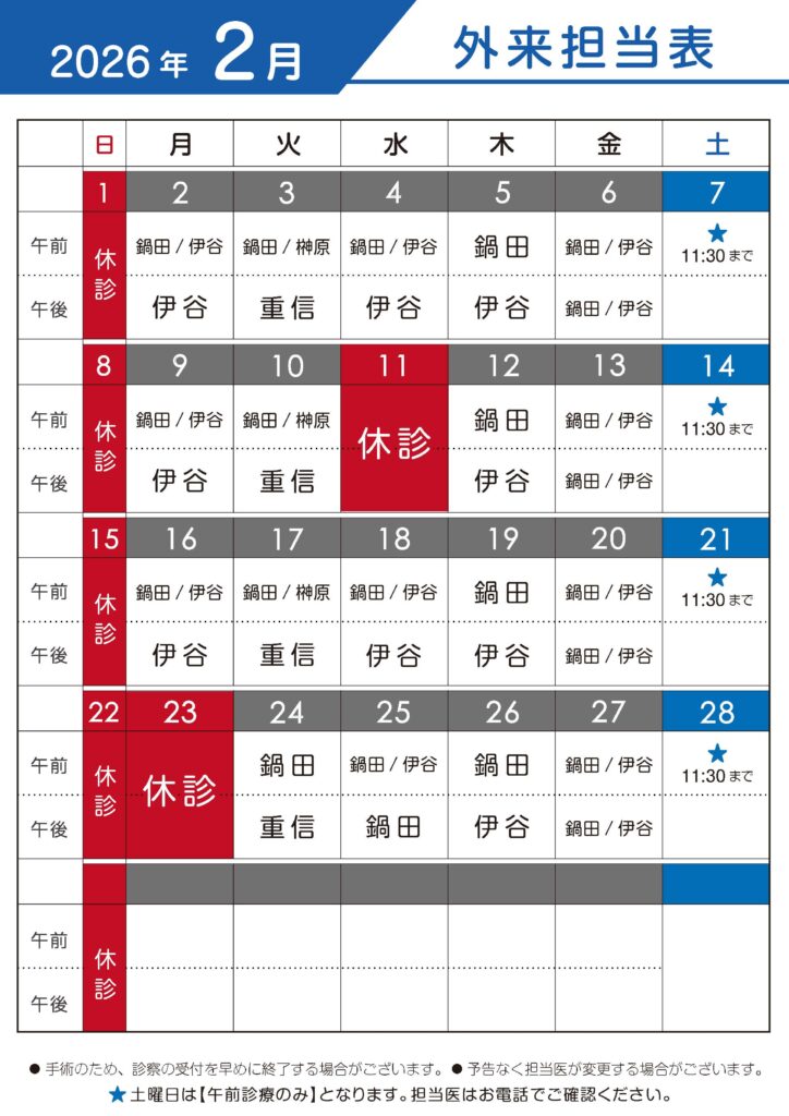 2026年2月・3月・4月の休診日に関するお知らせになります。下記の表からご確認ください。